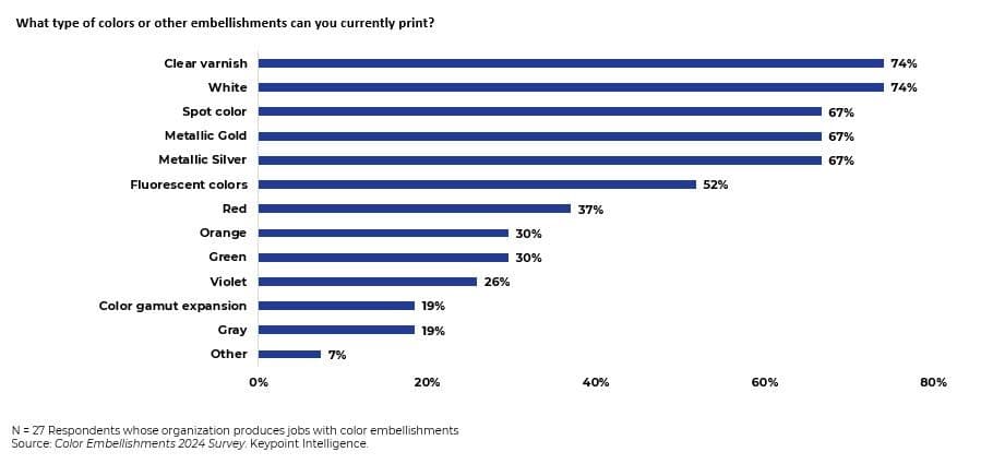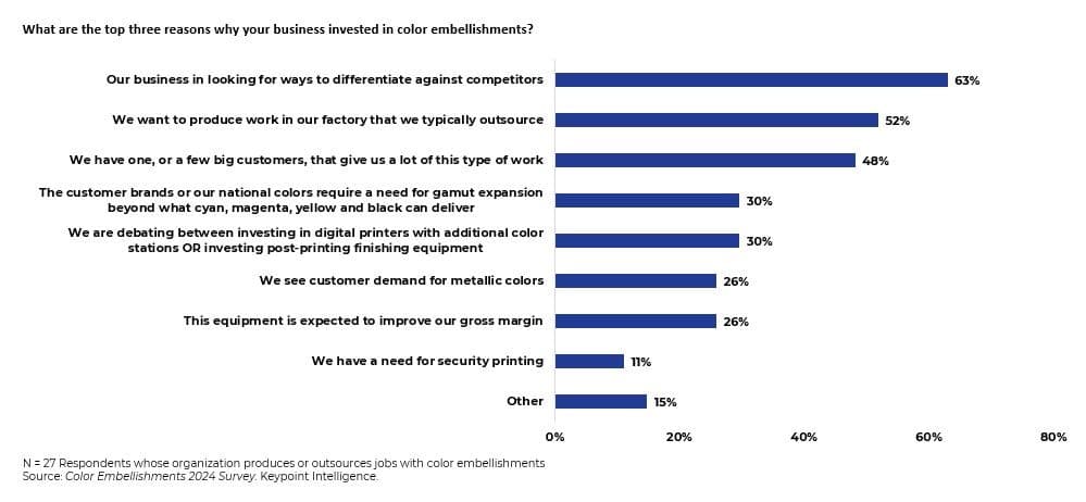 PSPs investing in color embellishments do so to differentiate themselves from competitors, with 63% of respondents highlighting this as one of their primary motivators. Other significant factors include the desire to bring outsourced work in-house (52%) and the presence of large clients demanding embellishments (48%). Additionally, PSPs noted that their customers require a wider color gamut to hit those all-important brand color palettes. Others are motivated by the need to meet customer demand for metallic colors or to improve their gross margins. What these findings clearly show is that, for many PSPs, the ability to offer embellishments not only enhances competitiveness, but also aligns with customer expectations and operational efficiency.