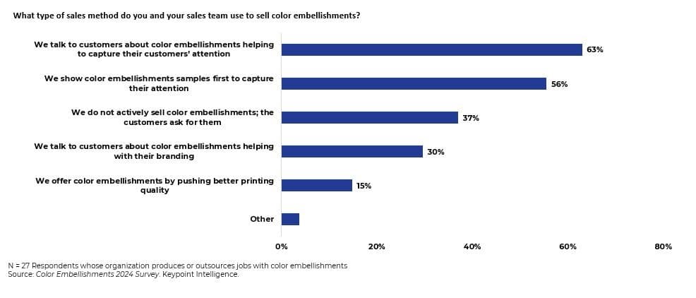 However, many respondents revealed that they do not actively sell color embellishments; rather, it was up to the customer to approach them. This is a clear opportunity for PSPs to seize the initiative. Why sit back and wait if they’ve invested in technology that could unlock business opportunities and fuel growth?
