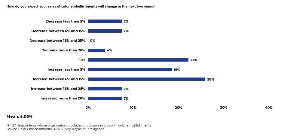 Looking ahead, market growth appears healthy. The survey data reveals that some PSPs are planning to increase their investment in embellishment-capable presses within the next year, which aligns with most respondents expecting a rise in sales of embellishments over the next two years.