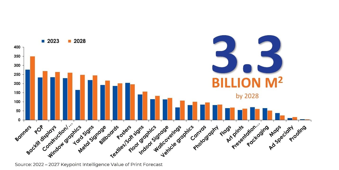 With a forecasted 3.3 billion square meters of printed applications in the next five years, as customer demands shift and technologies advance, print service providers (PSPs) must continuously adapt to stay competitive. Insights from the 2023–2028 Keypoint Intelligence Value of Print Forecast and the 2024 Wide Format Application and Utilization Study provide a roadmap for navigating this landscape. By focusing on profitable applications, leveraging new technologies, and embracing creativity, PSPs can unlock significant revenue opportunities while meeting the challenges of an increasingly competitive market.